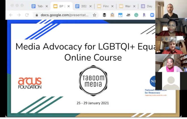 In January 2021, Taboom Media hosted its first-ever week-long Media Advocacy for LGBTQI+ Equality workshop. The Zoom workshop brought together more than 30 activists, regional trainers, and guest speakers from Angola, Botswana, the Democratic Republic of the Congo, Eswatini, Ghana, Kenya, Liberia, Malawi, Mauritius, Mozambique, Namibia, Nigeria, Rwanda, Sierra Leone, South Africa, Uganda, Zambia, and Zimbabwe.